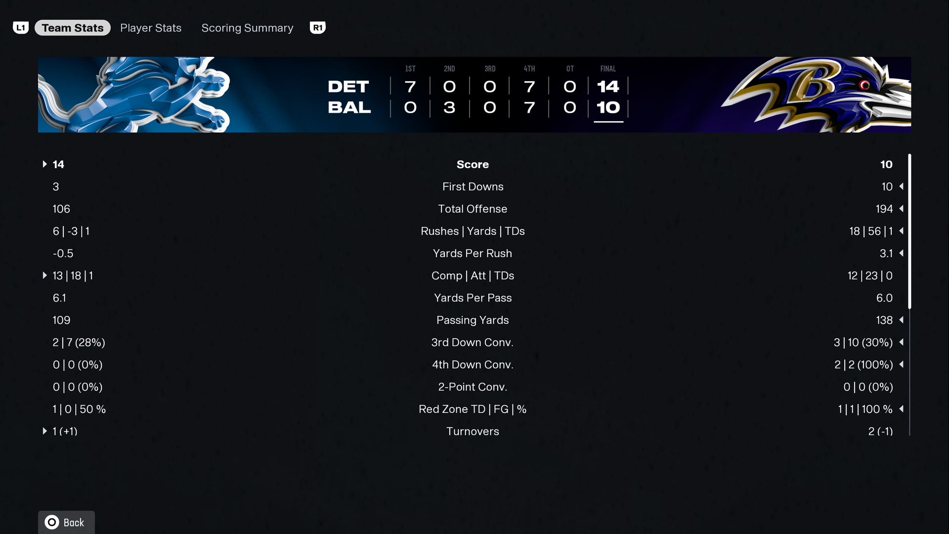 Let’s pop the first team stats screen in to show off what the CPU Lions did along with my human Ravens before we contextualize the results: