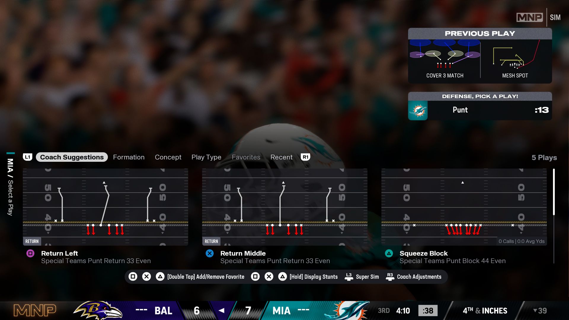 Ravens (CPU) vs. Dolphins (me) in a perfect weather Monday Night primetime game