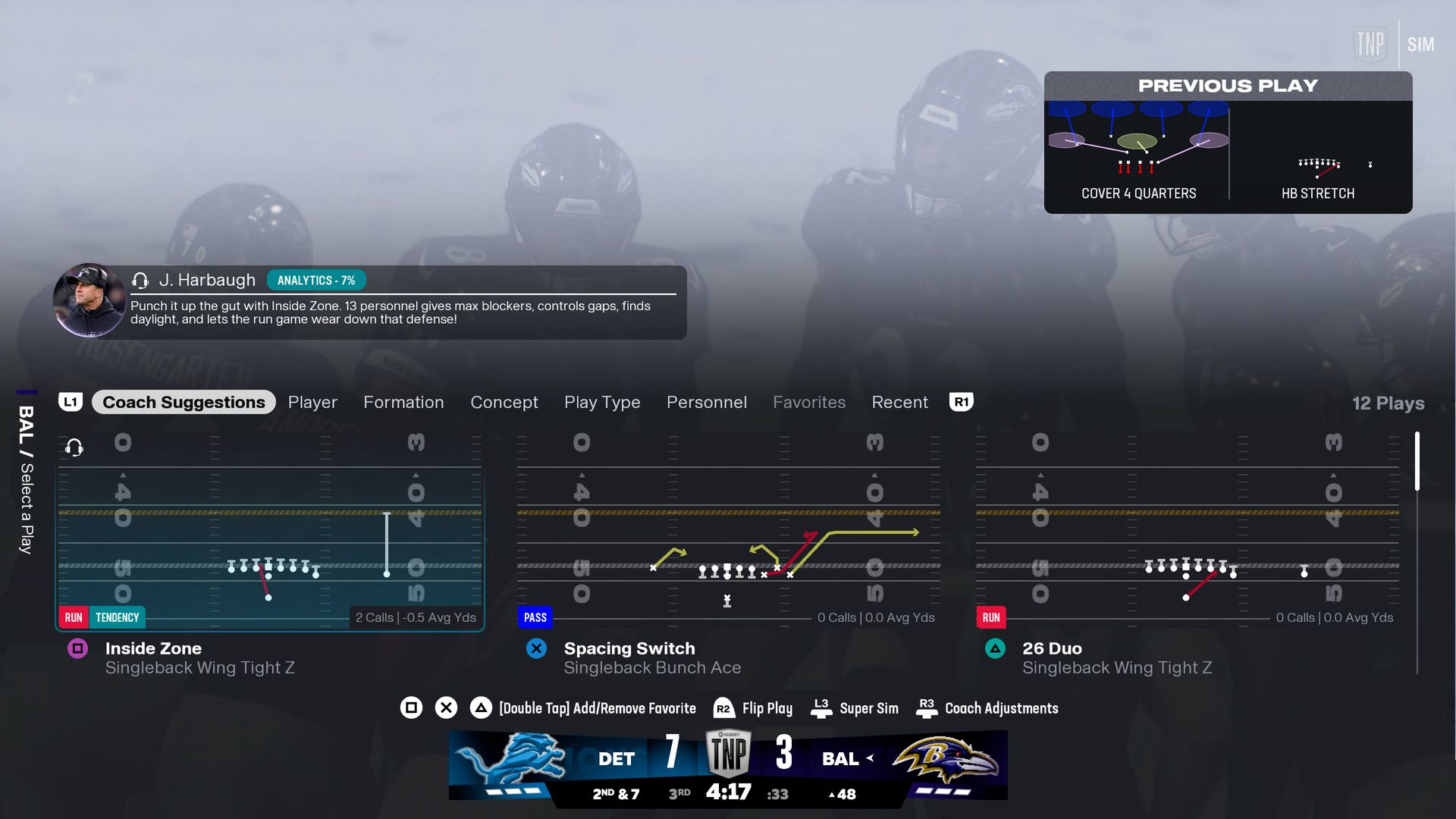 I LOVED the Coach Suggestions I was given as the Ravens. Full stop. I was offered tons of 12, 13, and even 22 (2 RBs, 2 TEs) personnel plays as the first suggestion. One critique is the first suggestion was consistently HB Stretch. I do think Stretch is going to be very meta and hard to handle online due to my general concerns about how often the edge gets properly set, but as you can see by the rushing totals, it wasn’t meta in this game in the snow. On top of that, I obviously didn’t need to pick the top suggestion if I didn’t want to, and there were plenty of other rushing plays offered up along with Stretch, so it’s not a huge deal either way that Harbaugh was spamming Stretch as a first choice.