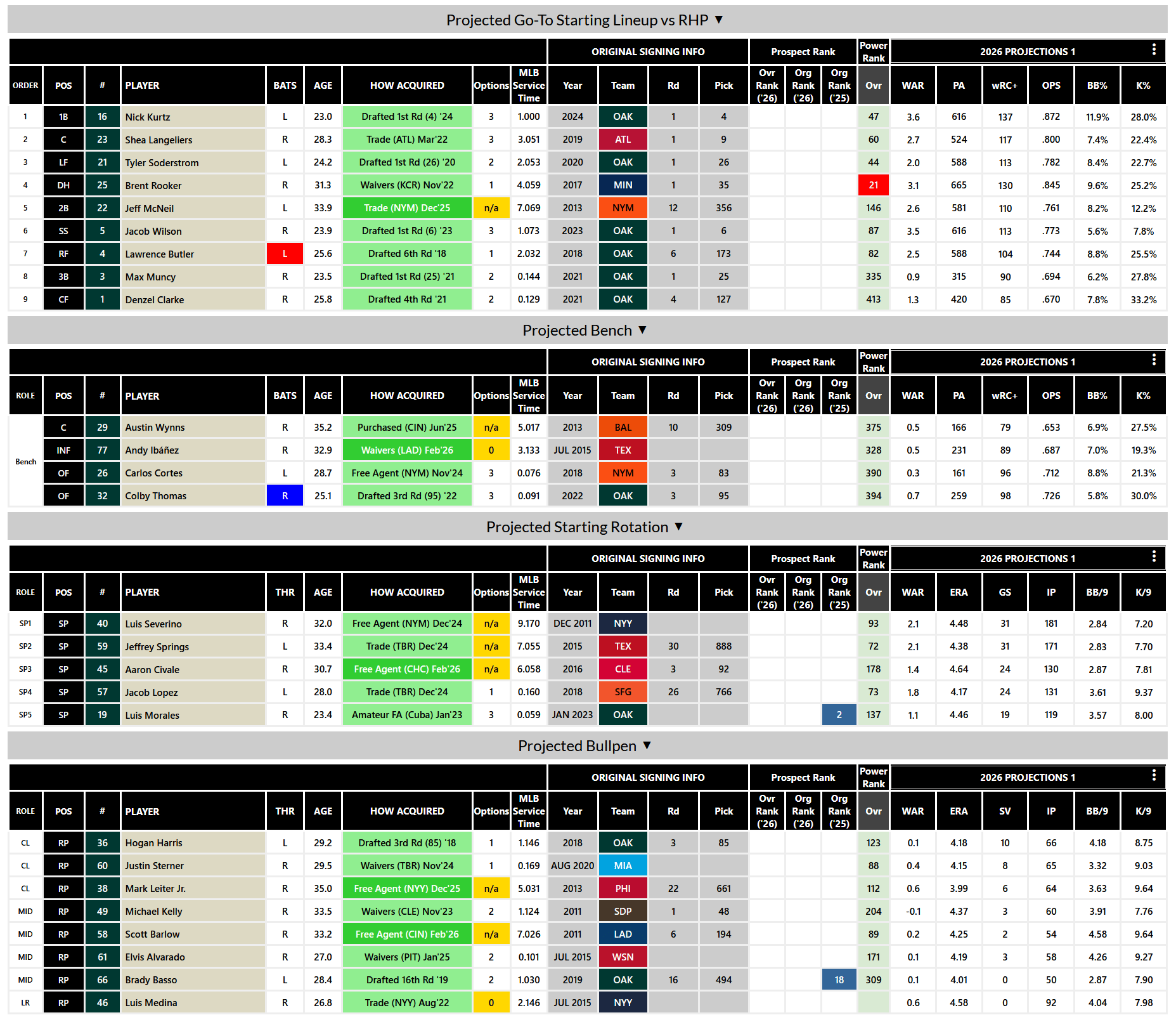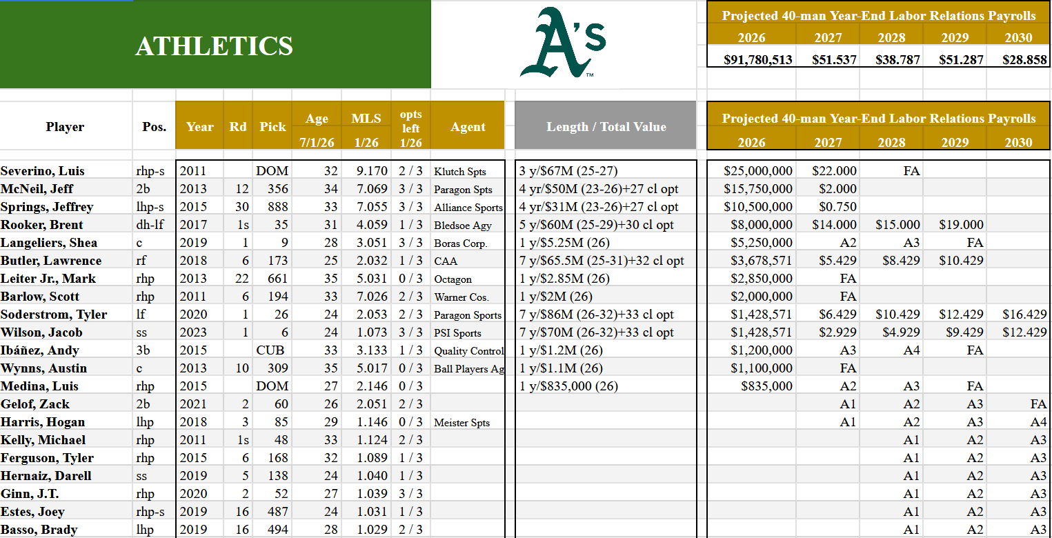 Contracts/Payroll: 92M (26th in MLB), at some point the Athletics may spend more once they’re in Vegas, but for now they’re still going to mostly play around the fringes. Severino gets paid for the next two seasons, but otherwise it’s mostly long-term deals that don’t start getting up there in price until a couple years down the line since they’re tied to pre-arb players.