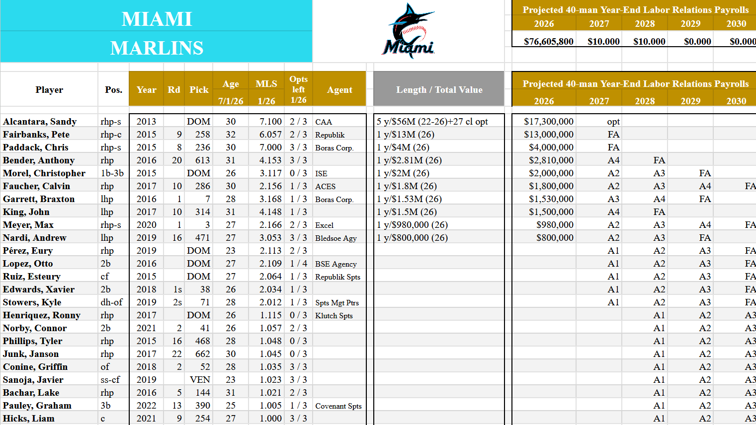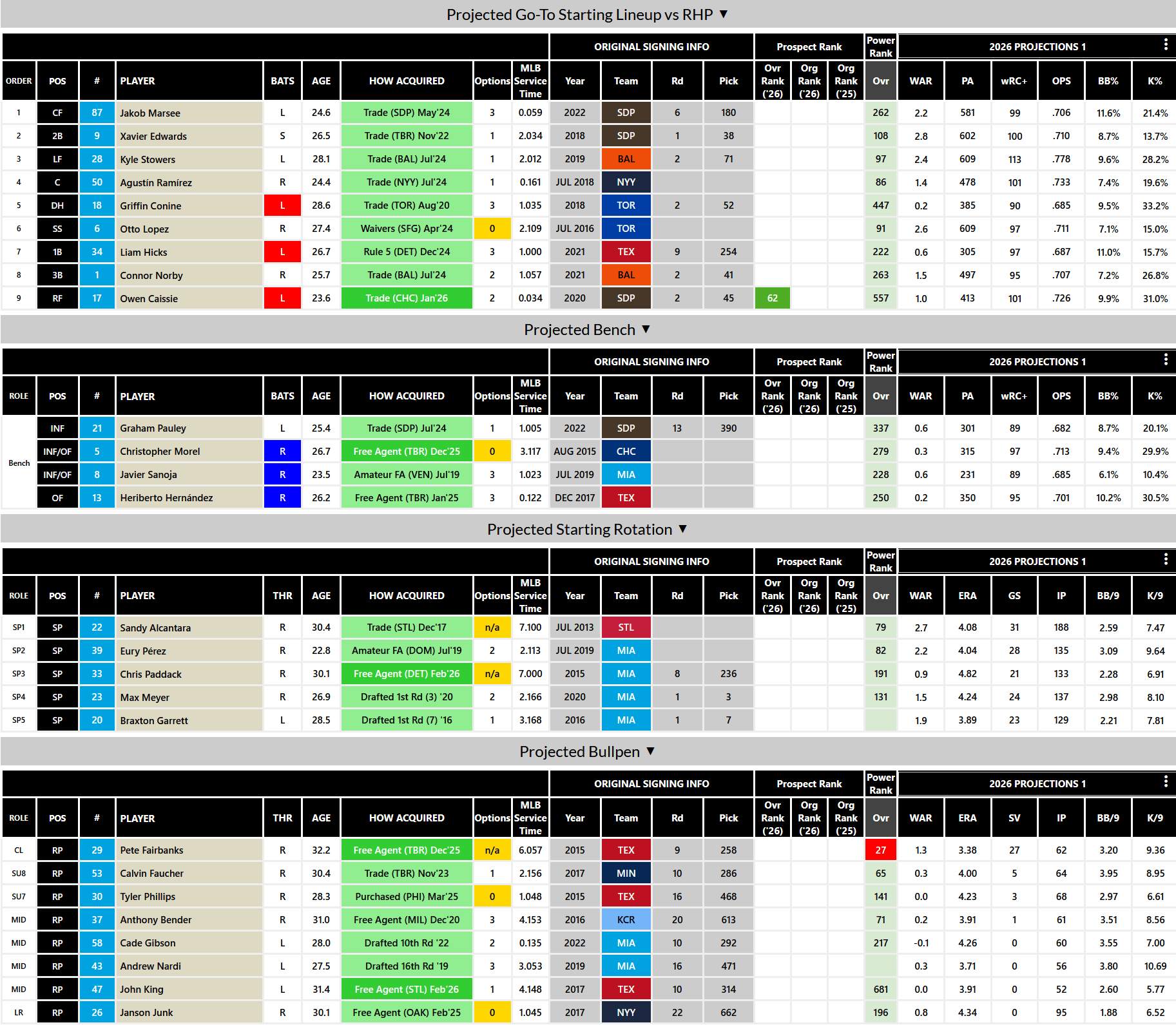 Contracts/Payroll: 77M (30th in MLB), the epitome of a cheap franchise, and they’ll always cry poor along the way, which makes it all the more insufferable. Alcantara has an opt-out, and I wonder how that will be handled in The Show, and I’m sure Pete Fairbanks might be offered up at the deadline as well if you struggle. This team could have as little as 10M in long-term money on the books next year before factoring in arbitration.
